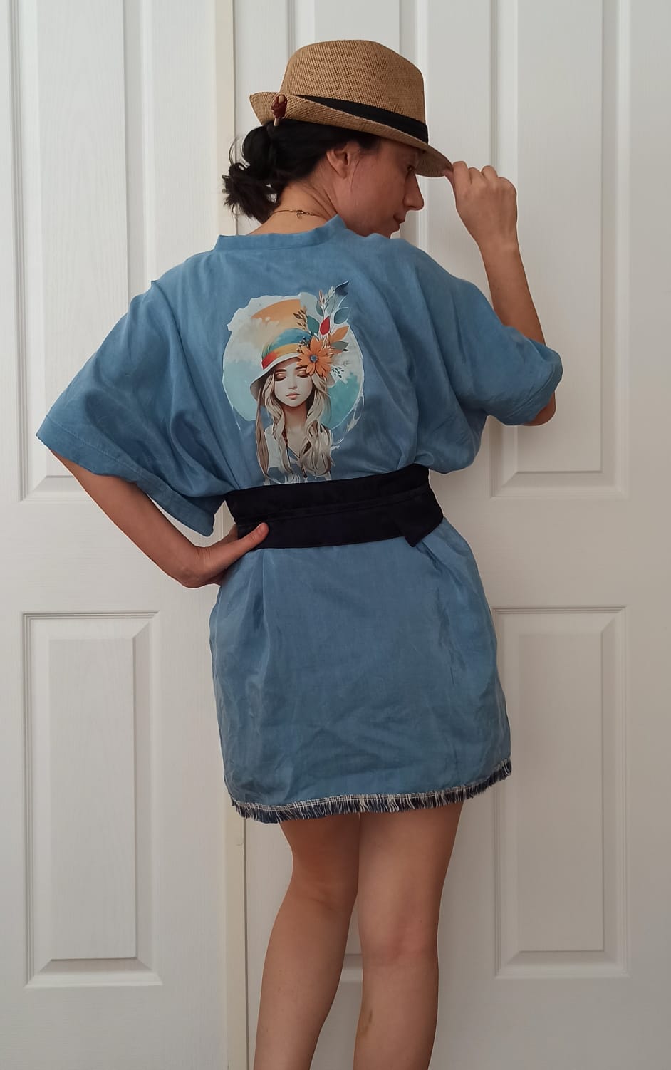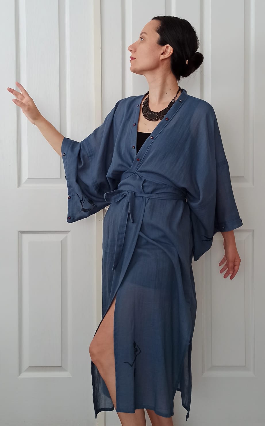 Boncuk İşlemeli El Boyama Figürlü Mavi Vual Kimono