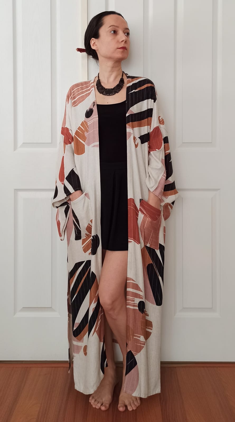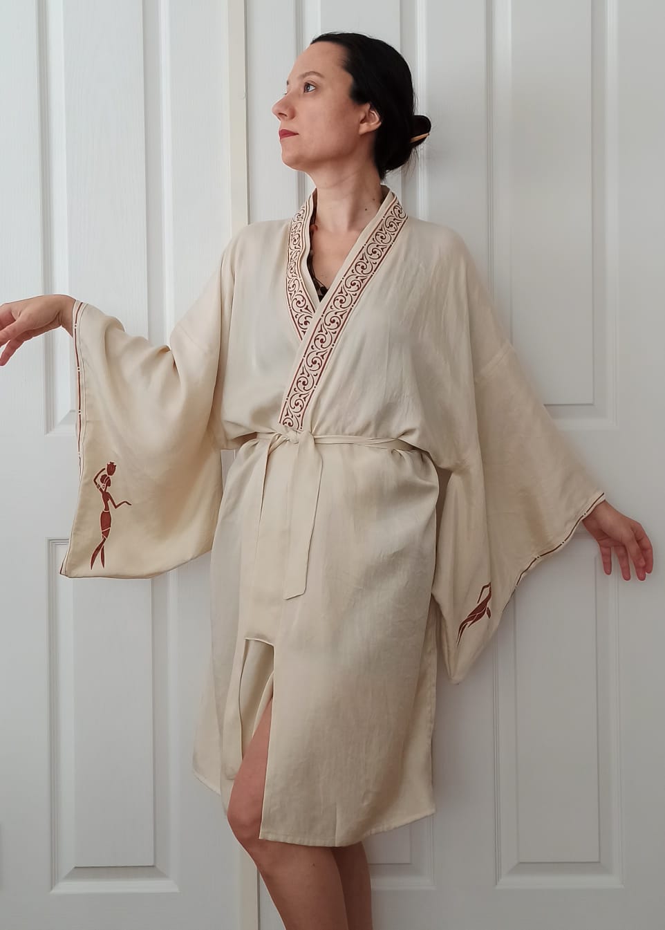 El Boyaması Kadın Figürlü Krem Rengi Kimono