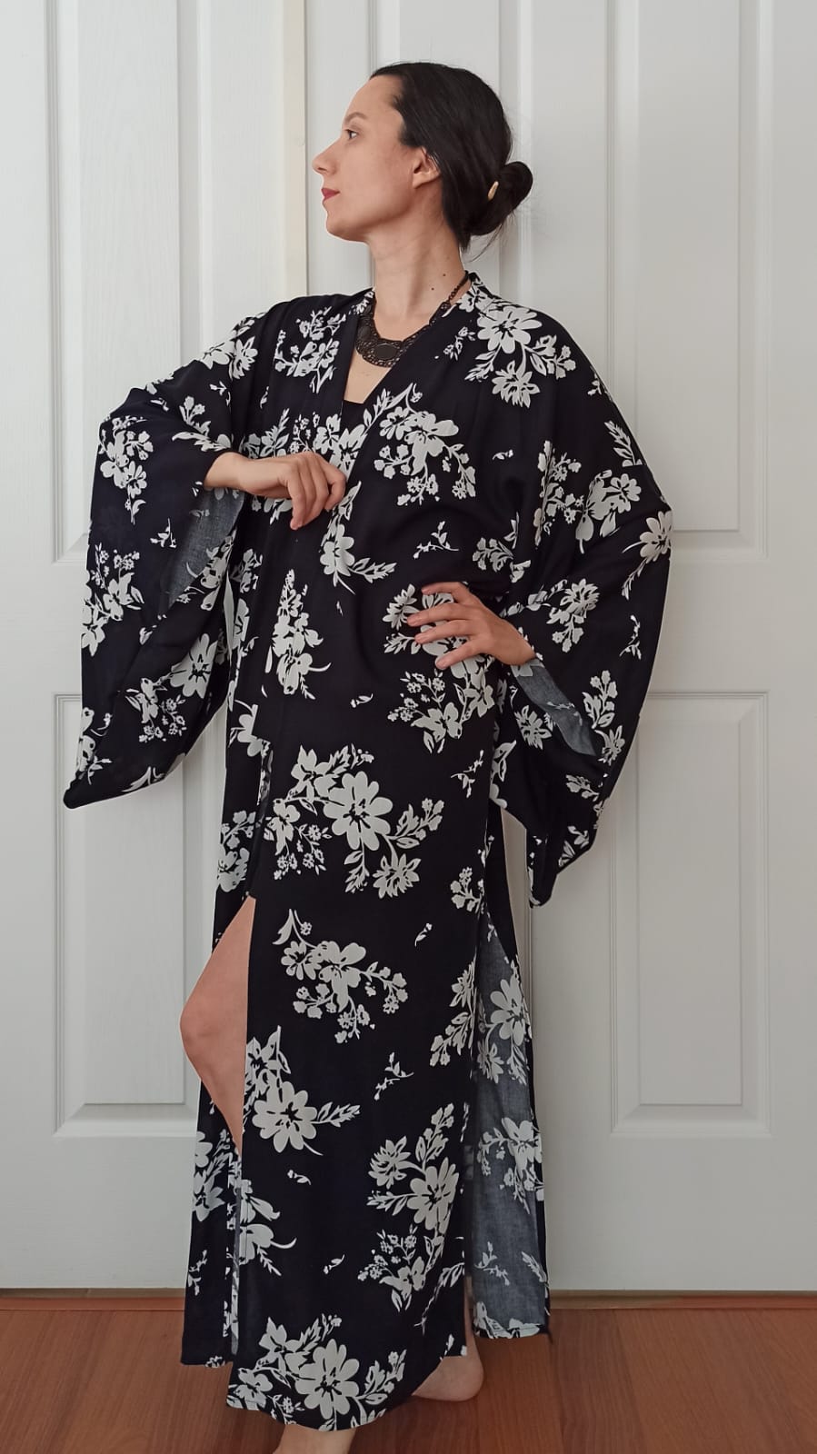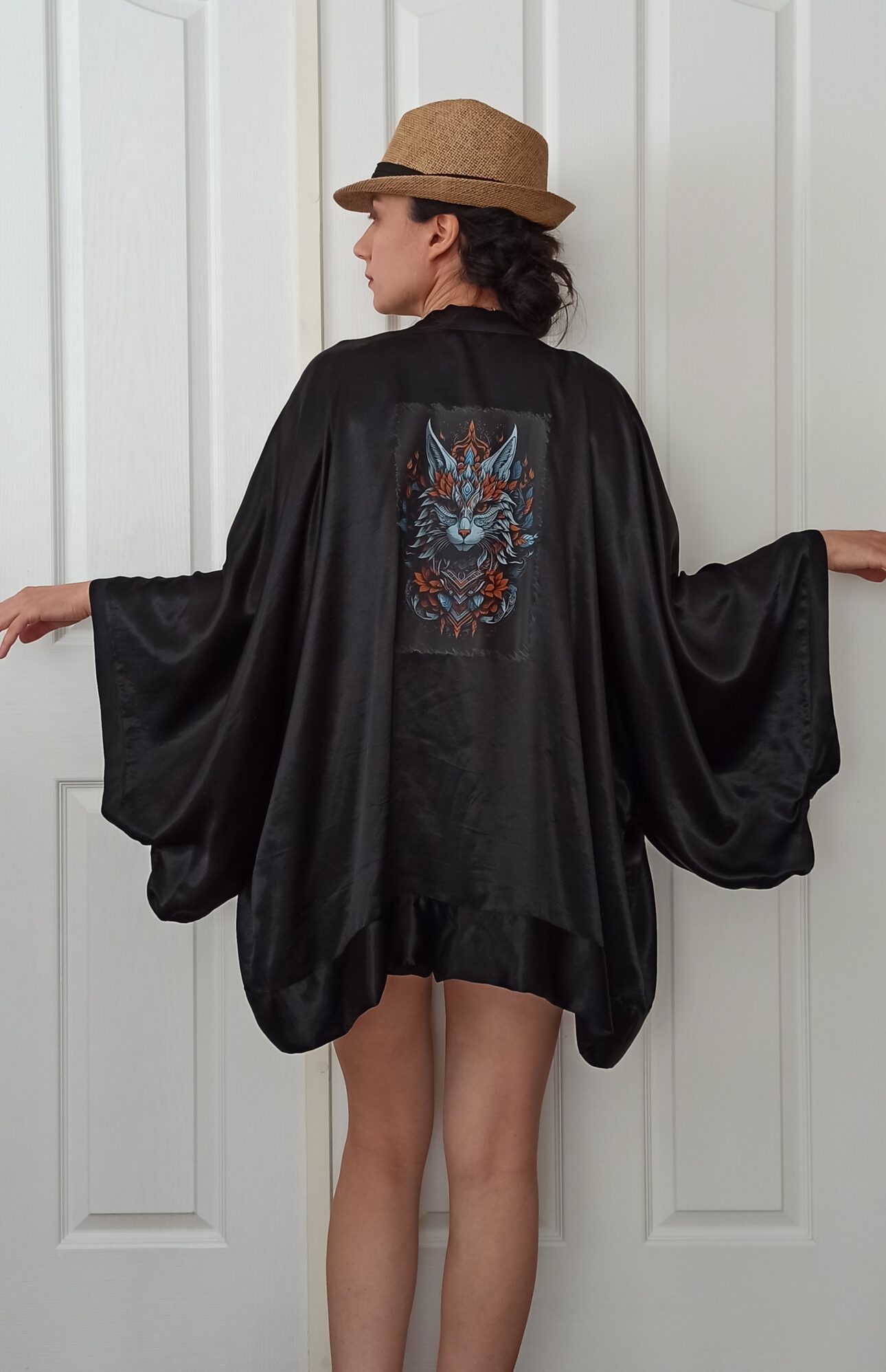 Sırt Baskılı Siyah Saten Kimono