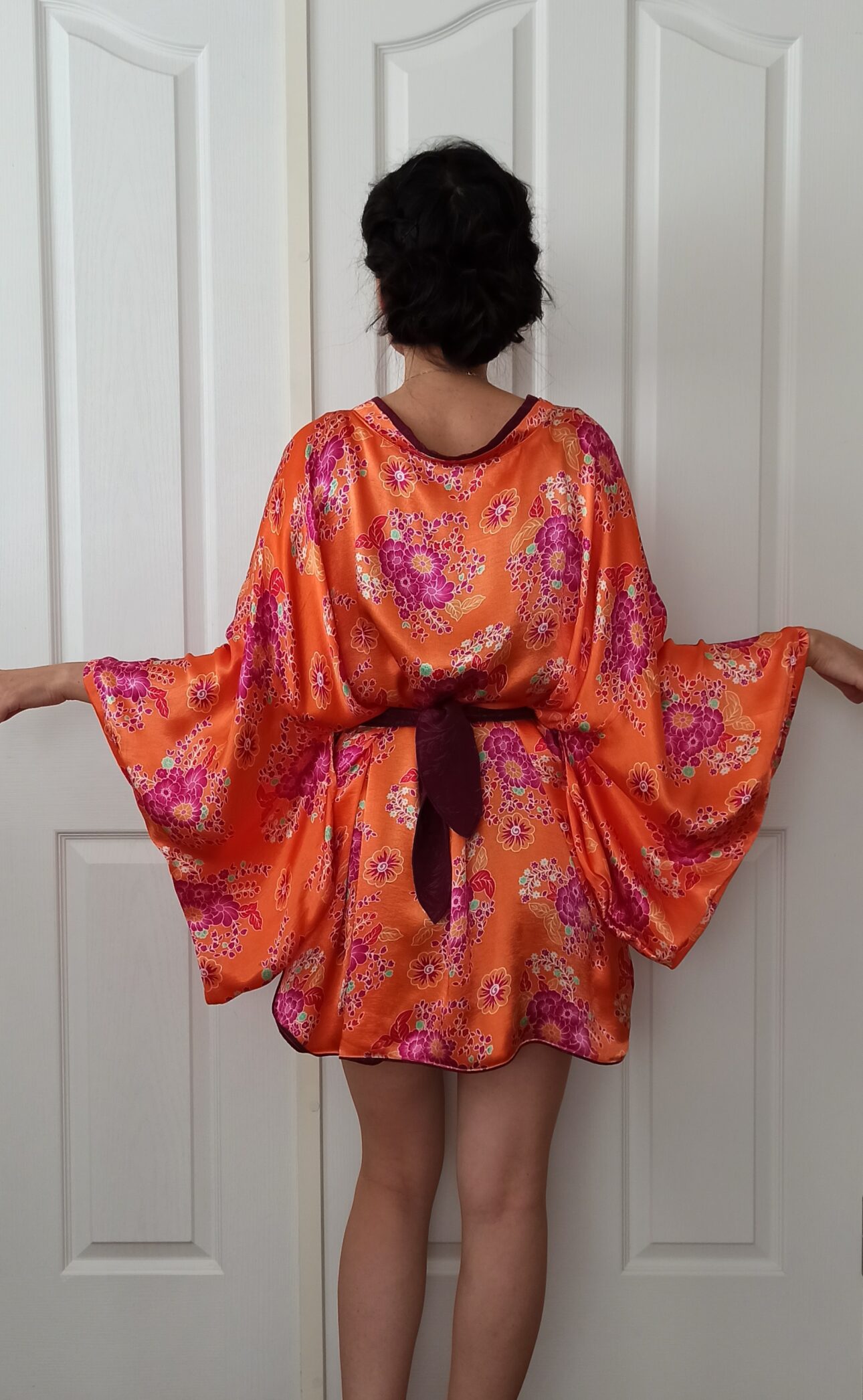 Mor İpek Kemerli Turuncu Saten Kimono