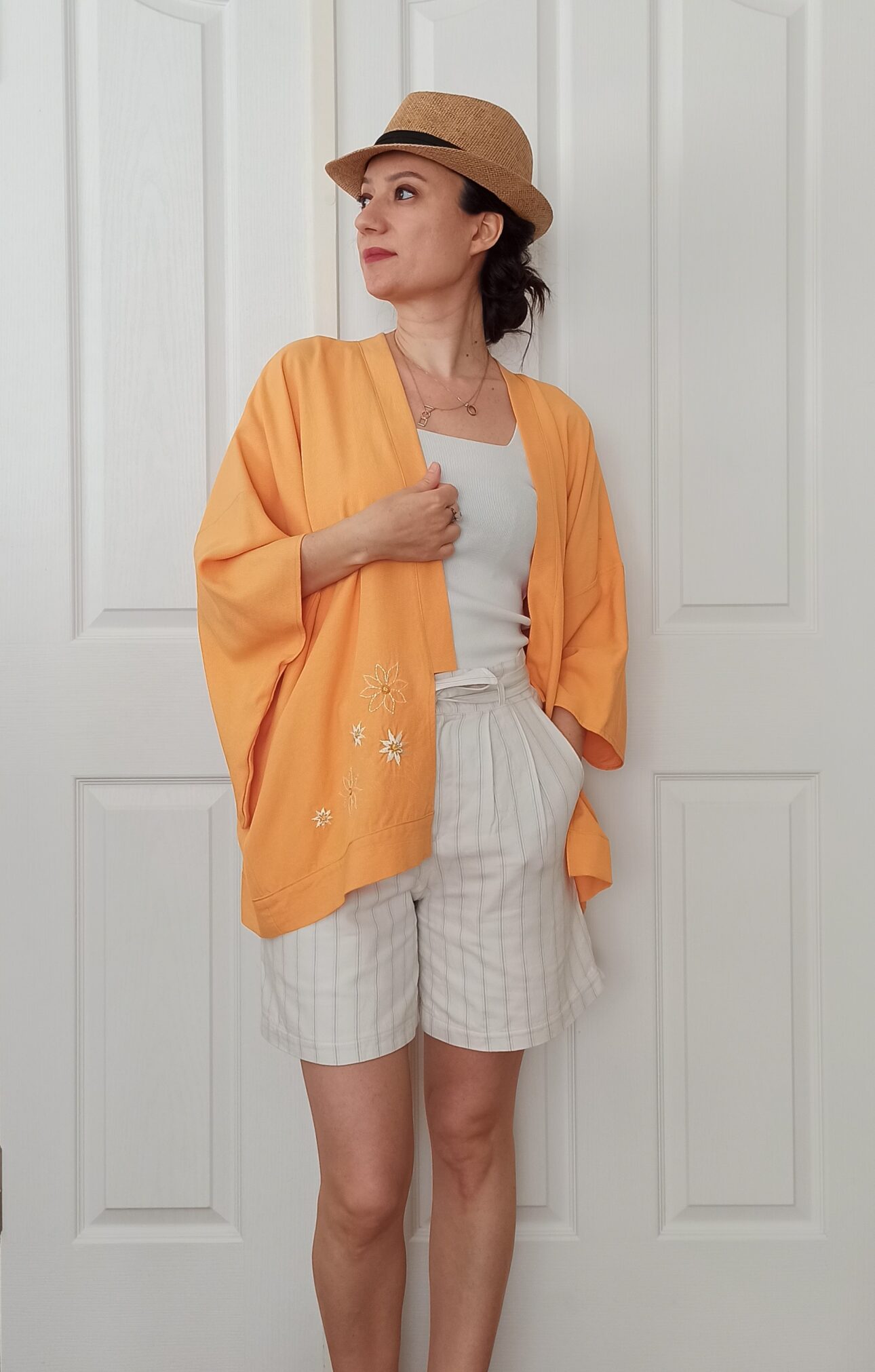 Papatya Nakışlı Turuncu Kimono