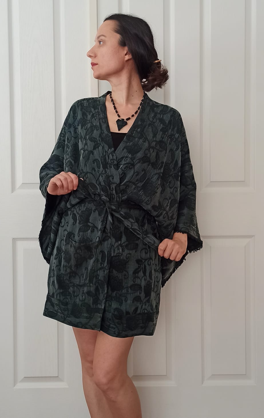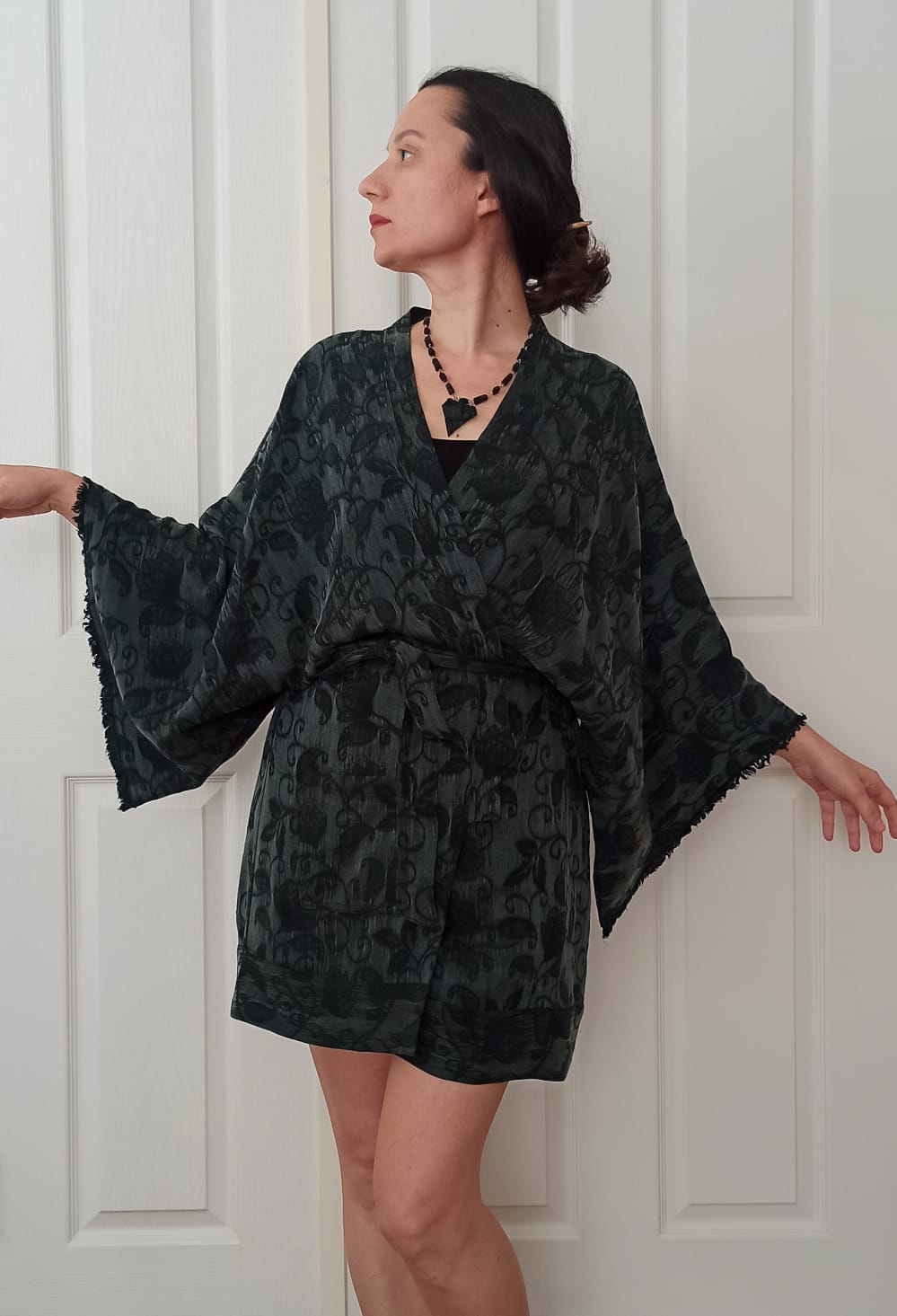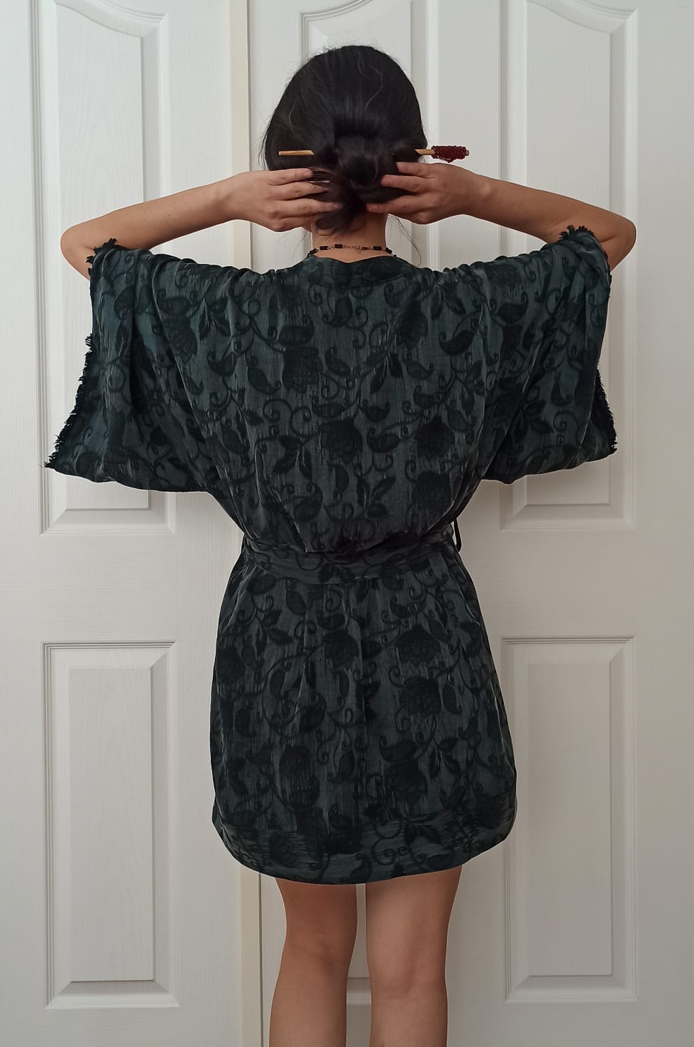 Zümrüt yeşili, hissi, duygusu harika bir kumaş. Hem dışarıda, hem evde giymeye uygun şık bir dokuya ve görünüme sahip. İpeğin sunduğu kalite, zümrüt yeşilinin sunduğu görsel şölenin bır araya geldiği güzel bir parça oldu. Ayrıca, artan kumaşlardan stilinizi tamamlayacak bir kolye de yaptım. Güzel anıların, anların bir parçası olması dileği ile…