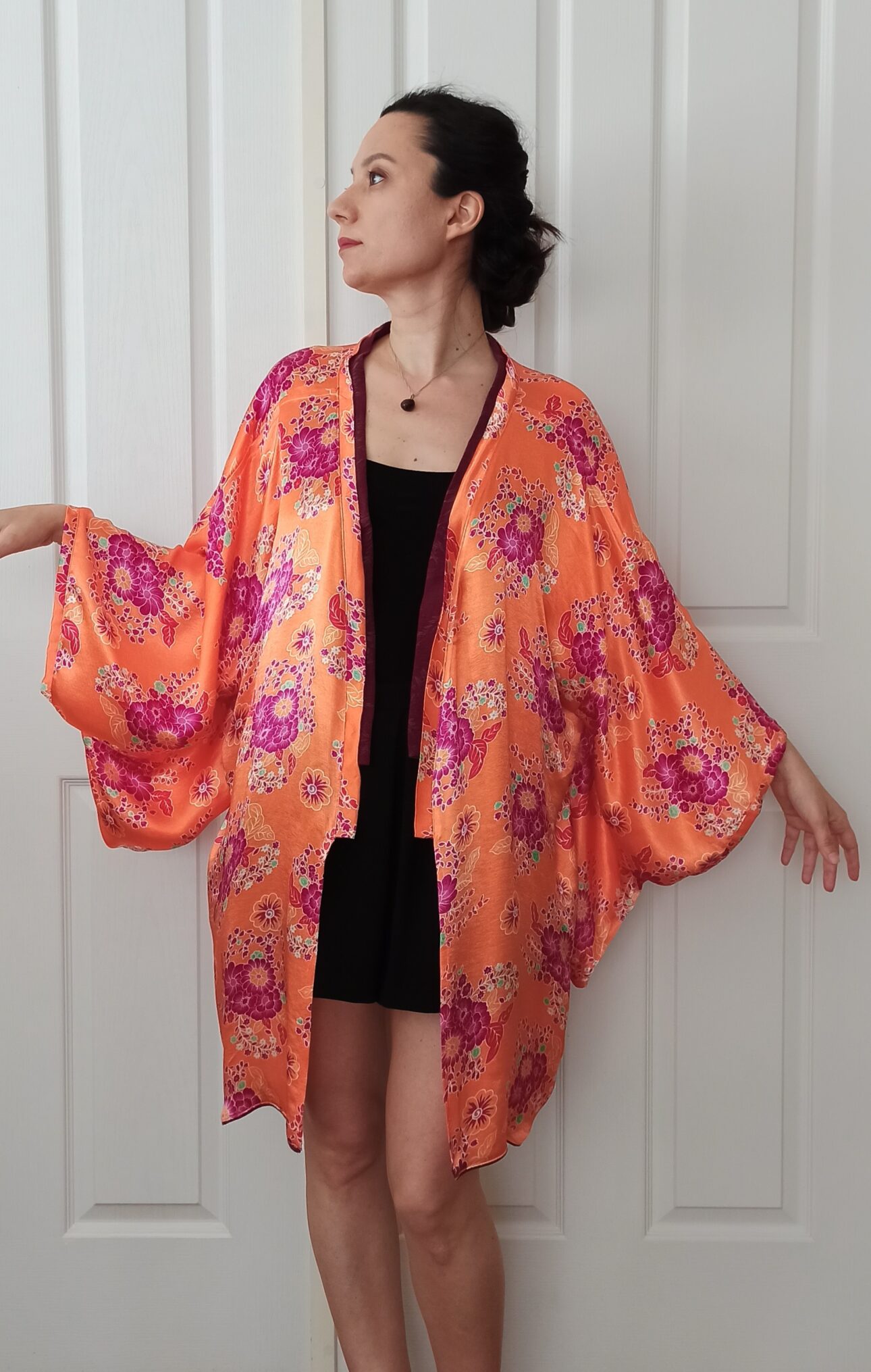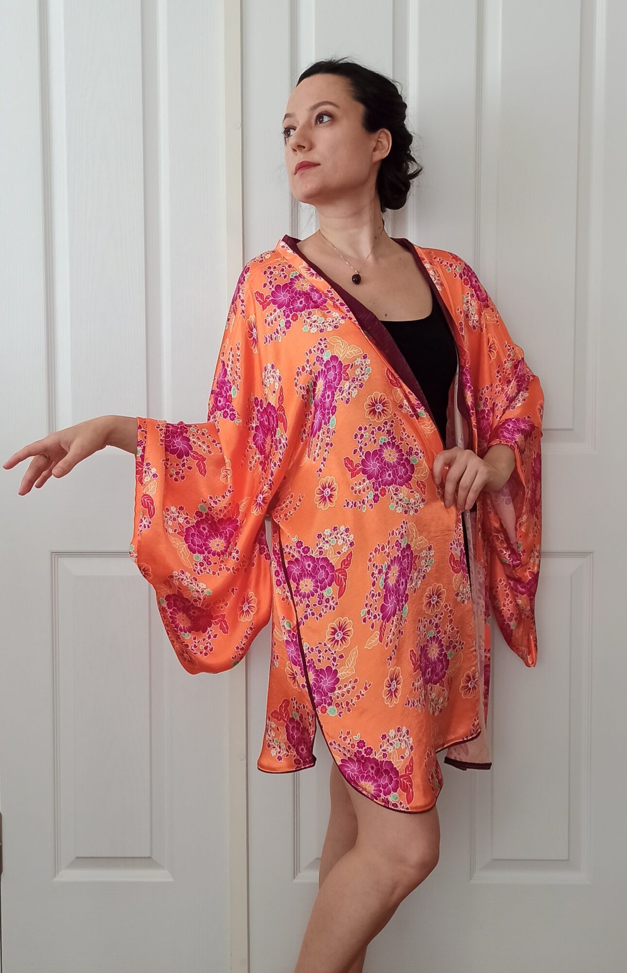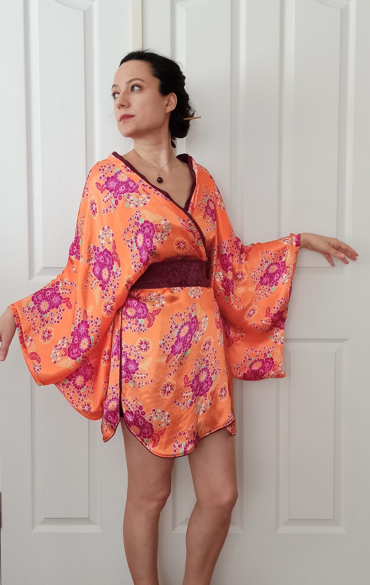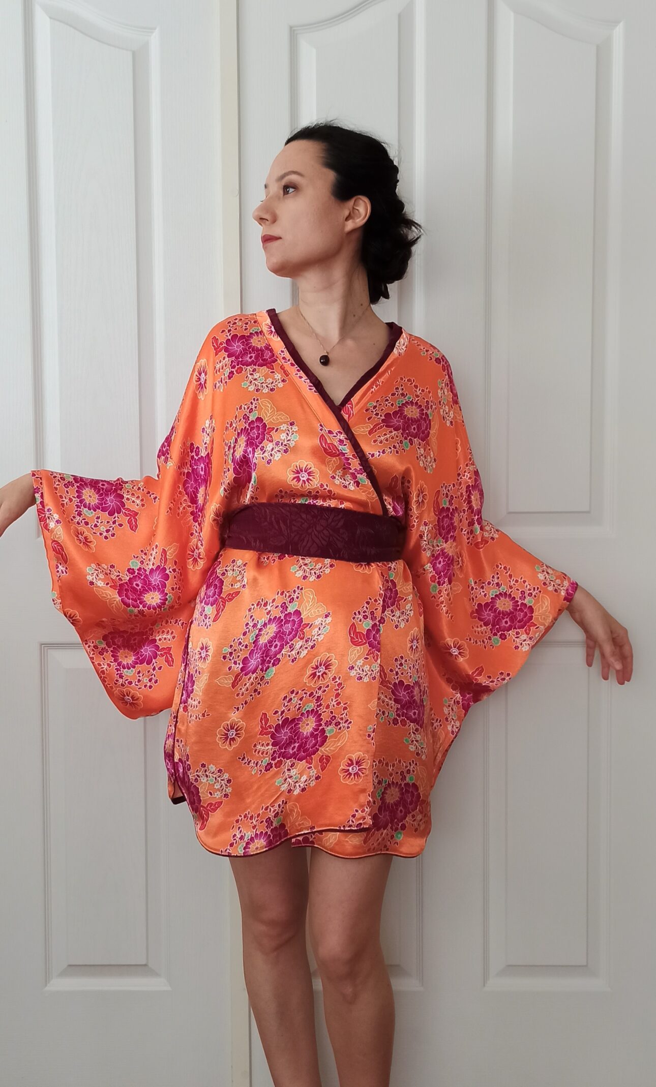 Yumuşacık doğal saten kumaş ile hazırladığım, giymesi çok keyifli, bir o kadar da seksi bir kimono çalışması ile karşınızdayım. Kumaşın canlı renklerini dengelemesi için mürdüm moru renginde ipek cupra kumaştan bir kemer hazırladım ve kemerle uyumlu olması için de etek uçlarına ve yakaya bu kumaştan ayrıntı ekledim. Sonuç benim çok hoşuma gitti. Dilerim güzel anıların bir parçası olur.