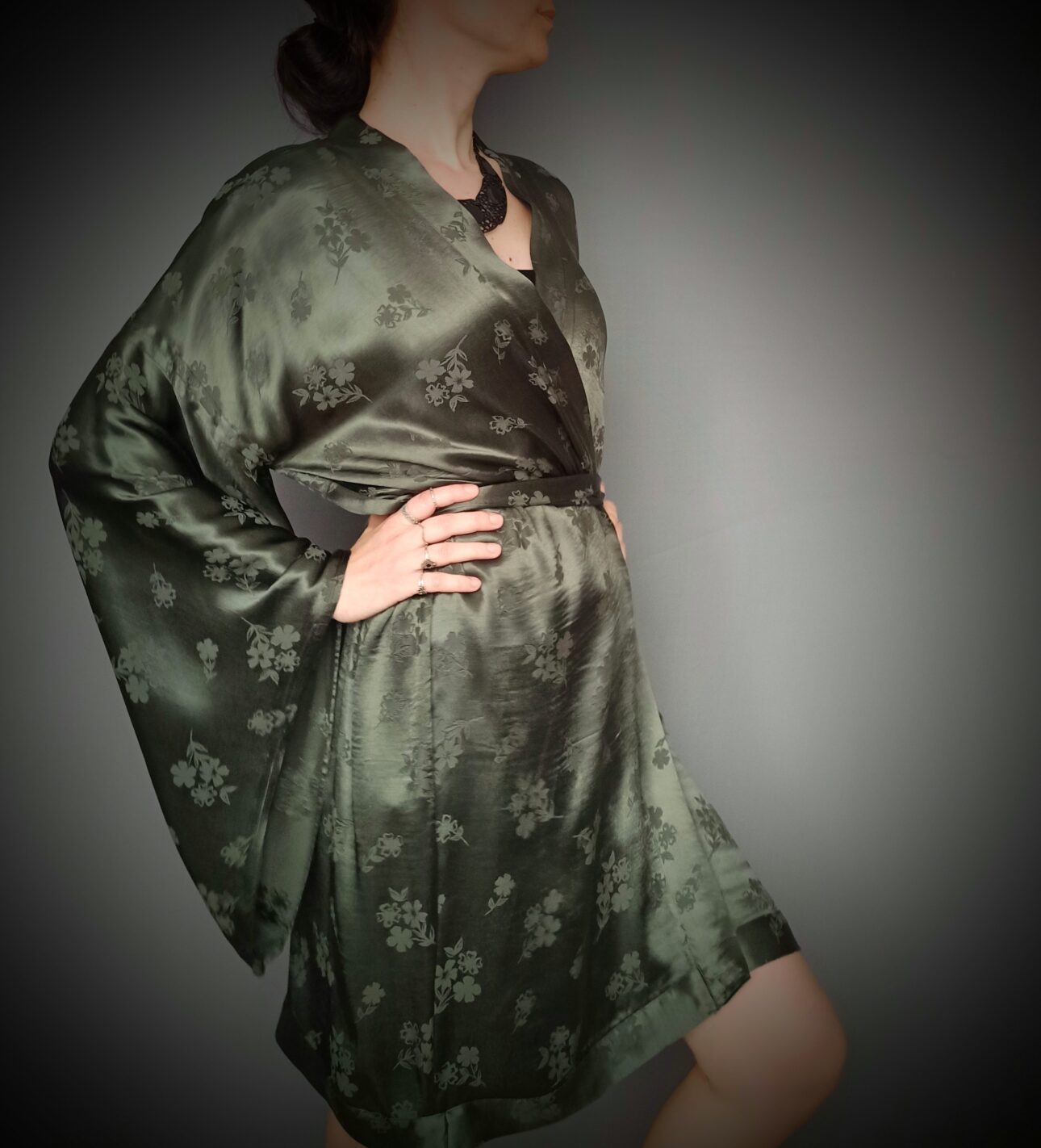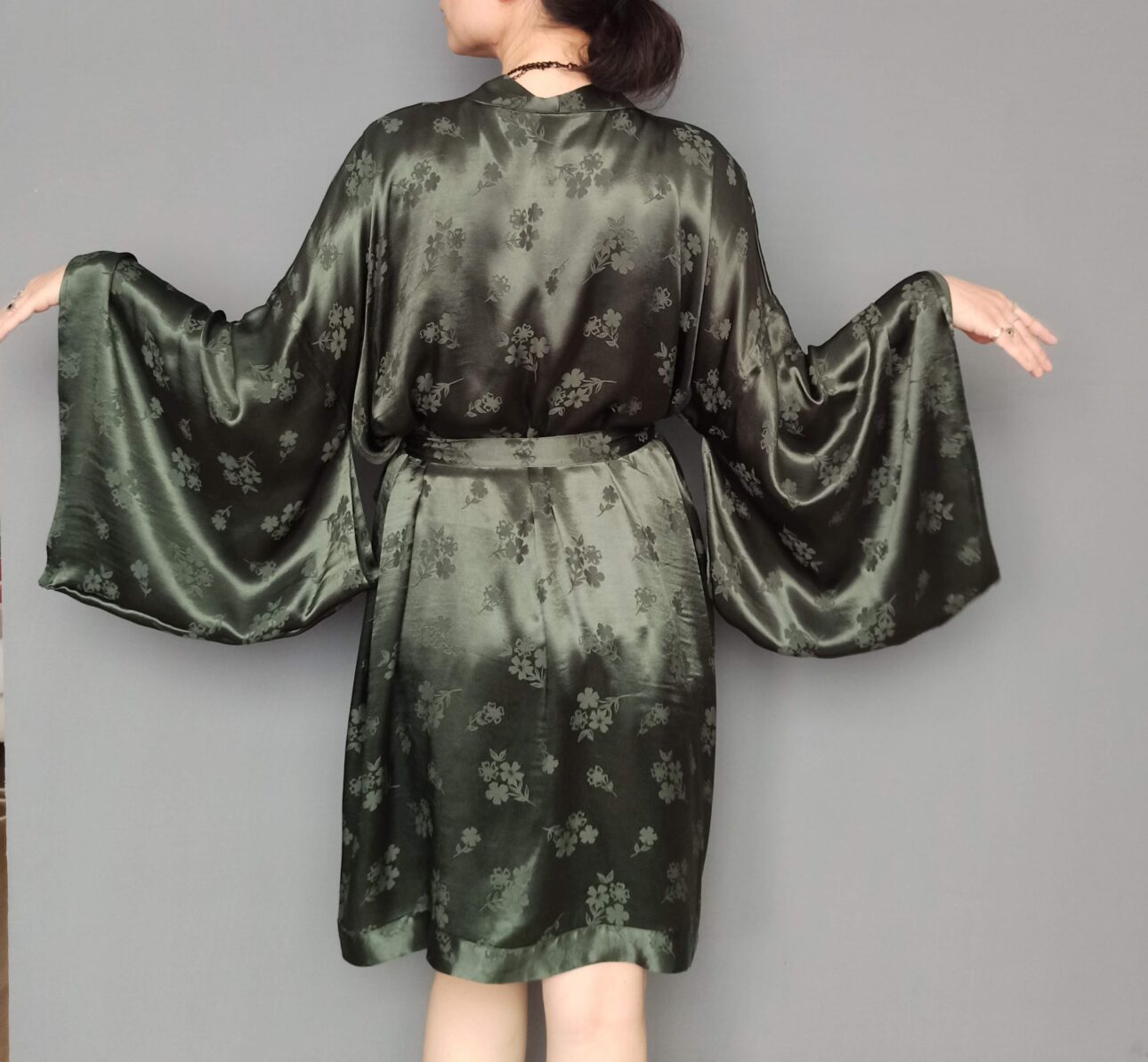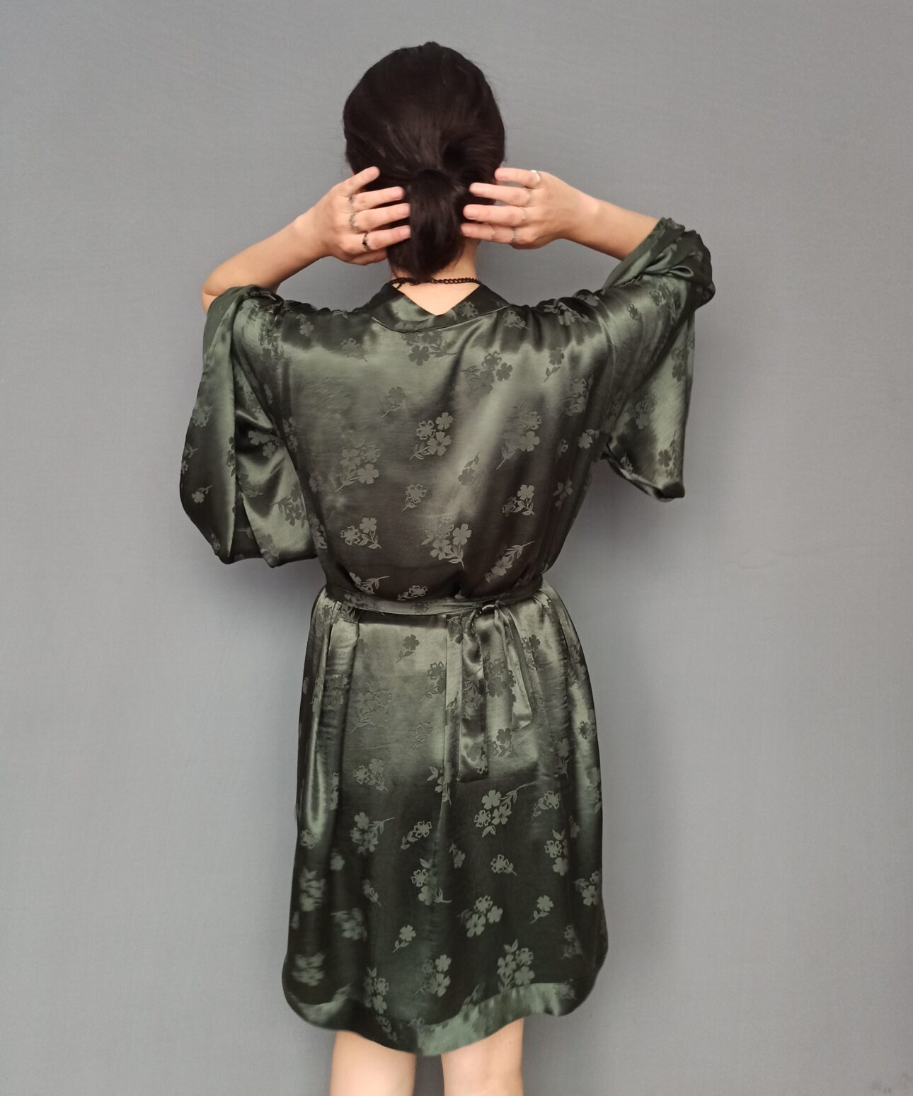 Yumuşacık dokusuyla, giydiğinizde, size harika hissettiren ipek kimono çalışmam. Dokuma yöntemiyle oluşturulmuş desenlerle kaplı kumaş, çok hoş bir akıcılık ve pürüzsüz bir yumuşaklığa sahip. Serin tutan yapısıyla bahar ve yaz aylarında çok kullanışlıdır.
