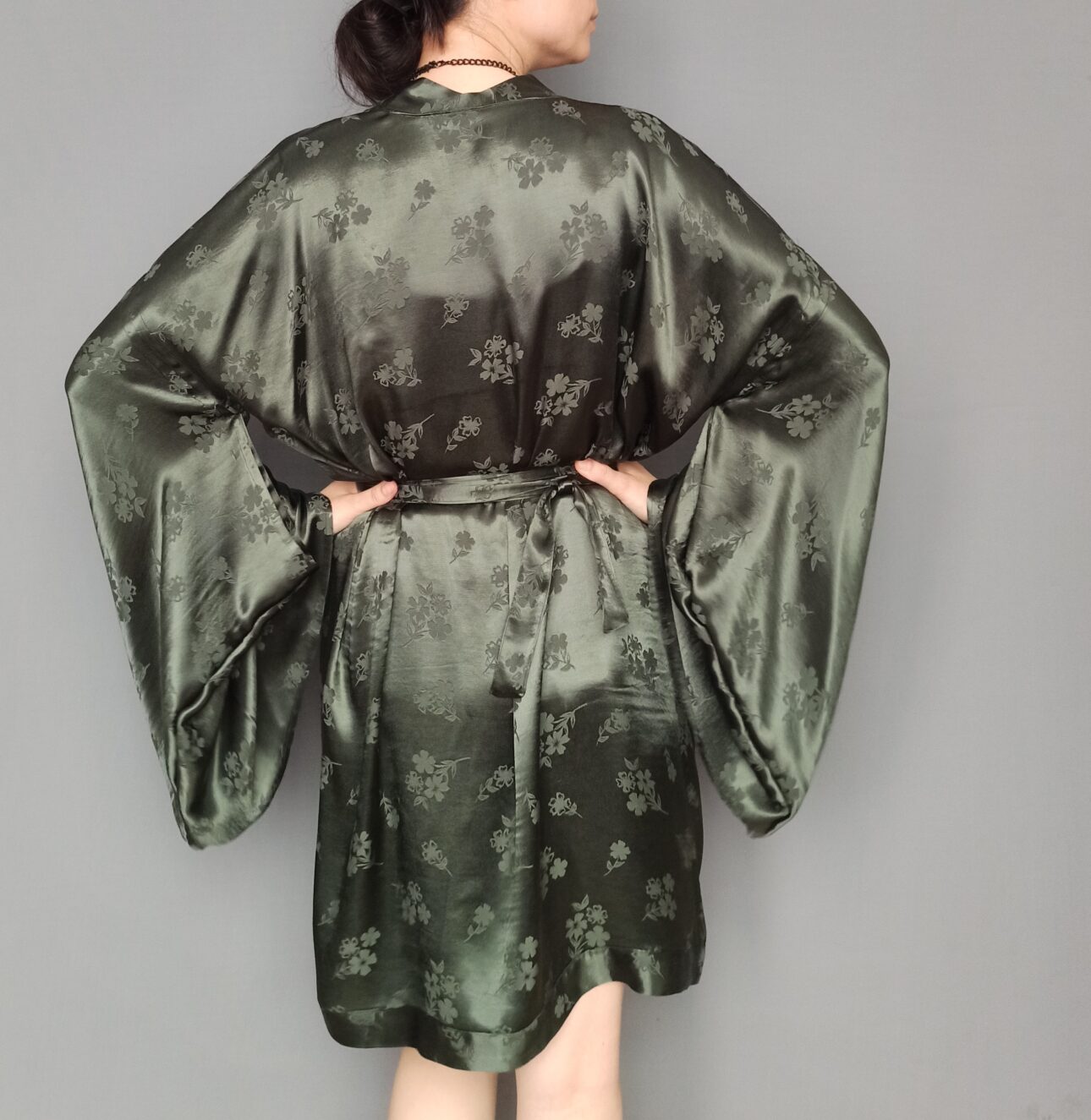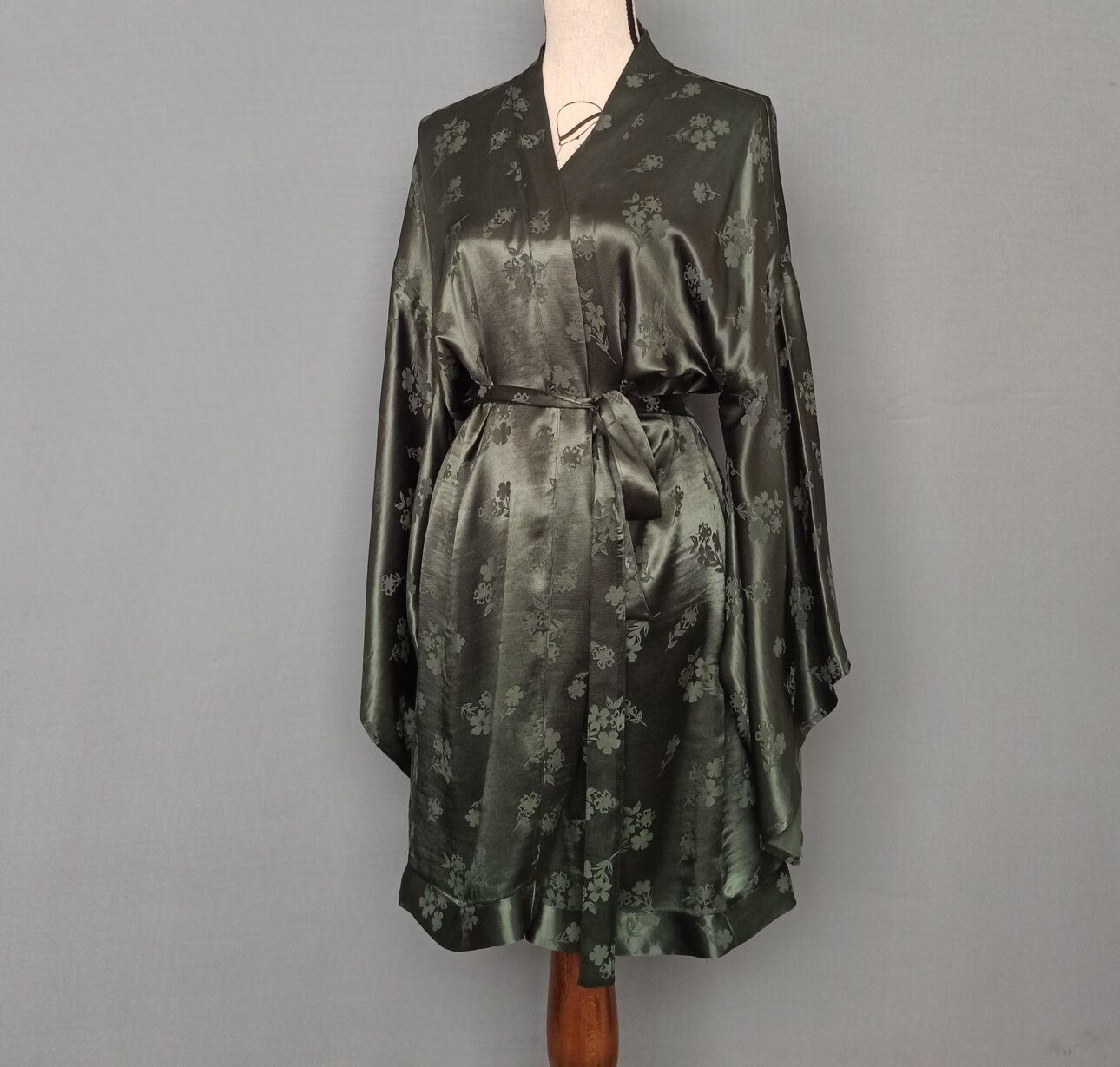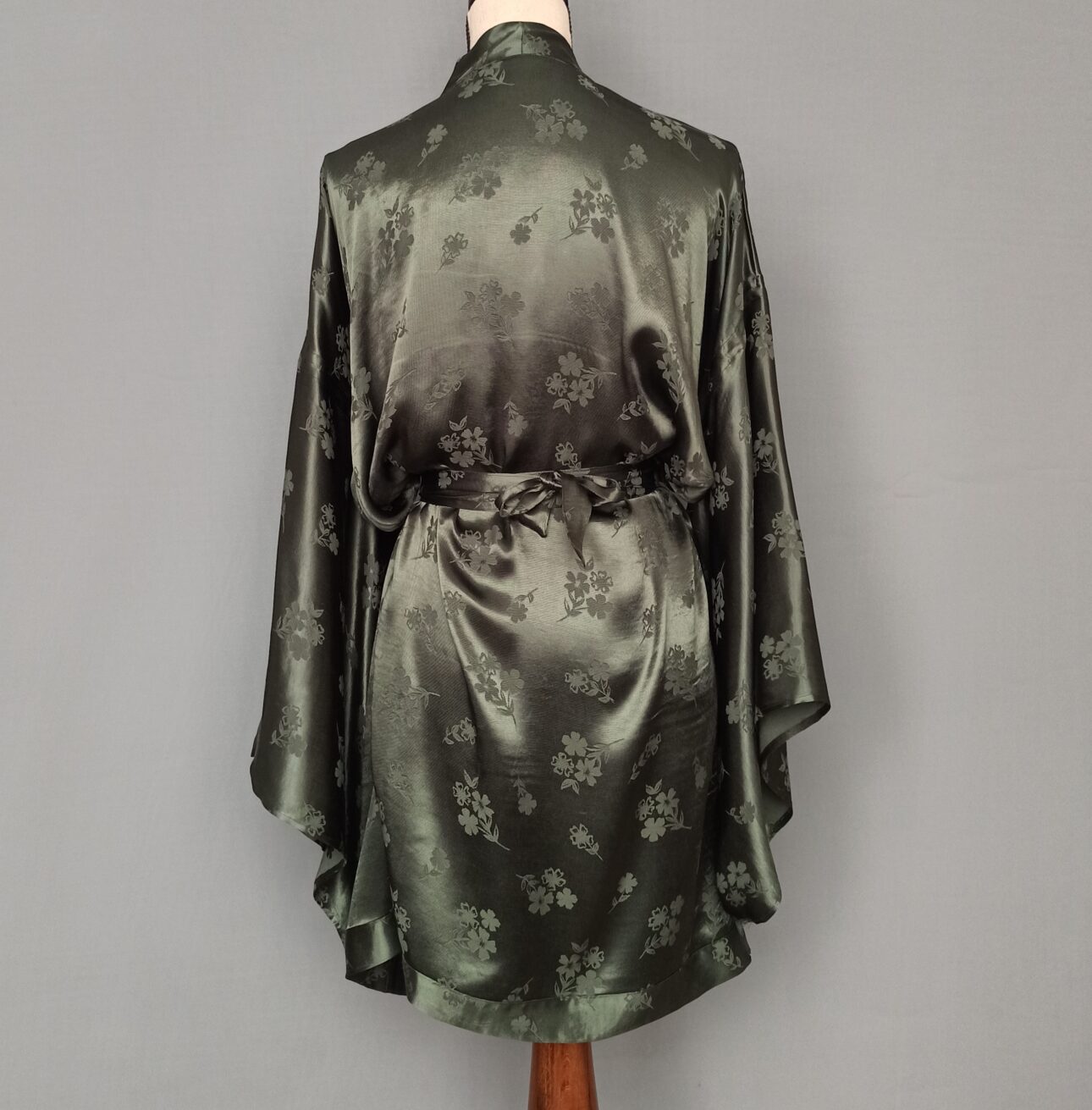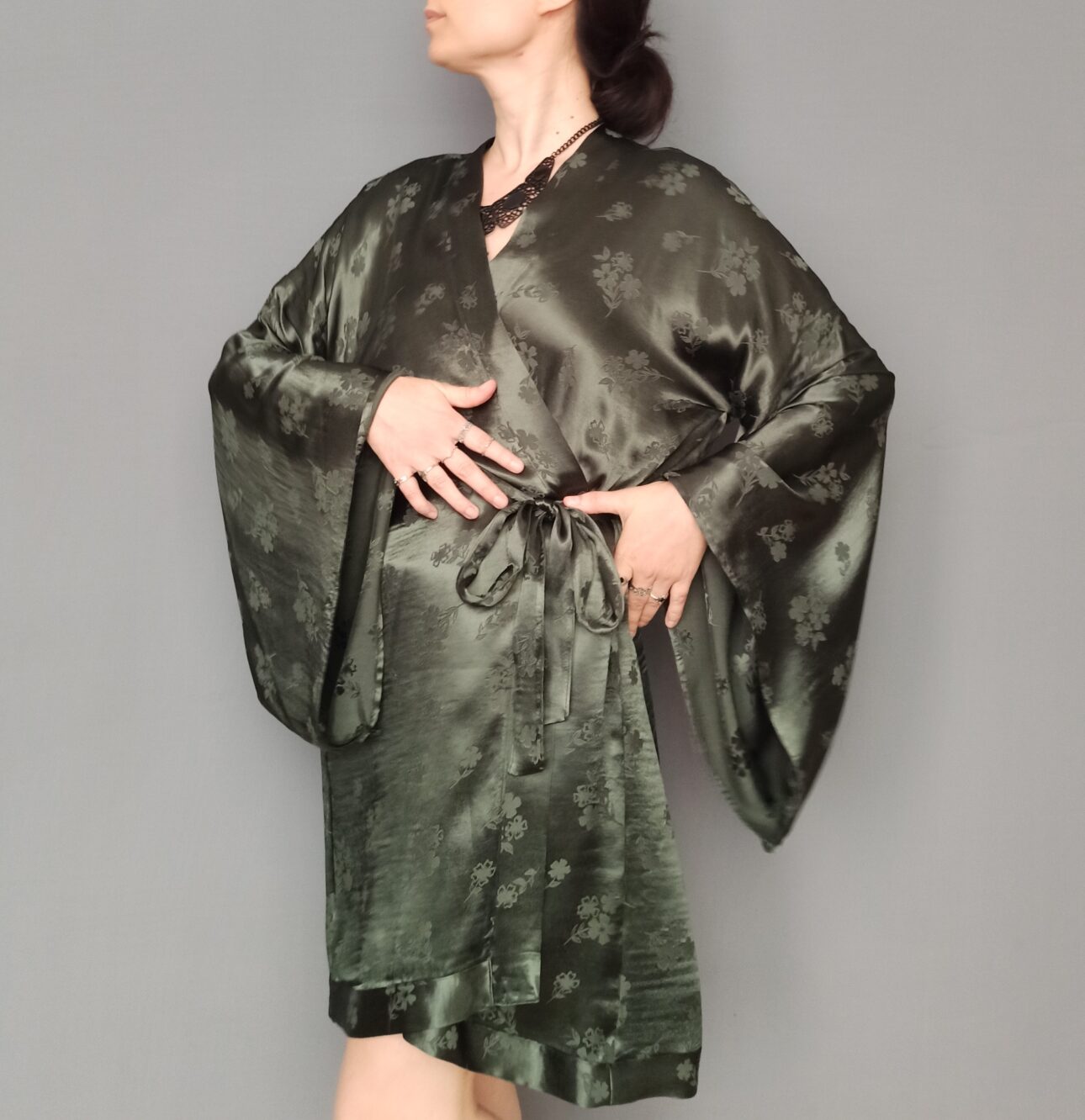 Yumuşacık dokusuyla, giydiğinizde, size harika hissettiren ipek kimono çalışmam. Dokuma yöntemiyle oluşturulmuş desenlerle kaplı kumaş, çok hoş bir akıcılık ve pürüzsüz bir yumuşaklığa sahip. Serin tutan yapısıyla bahar ve yaz aylarında çok kullanışlıdır.